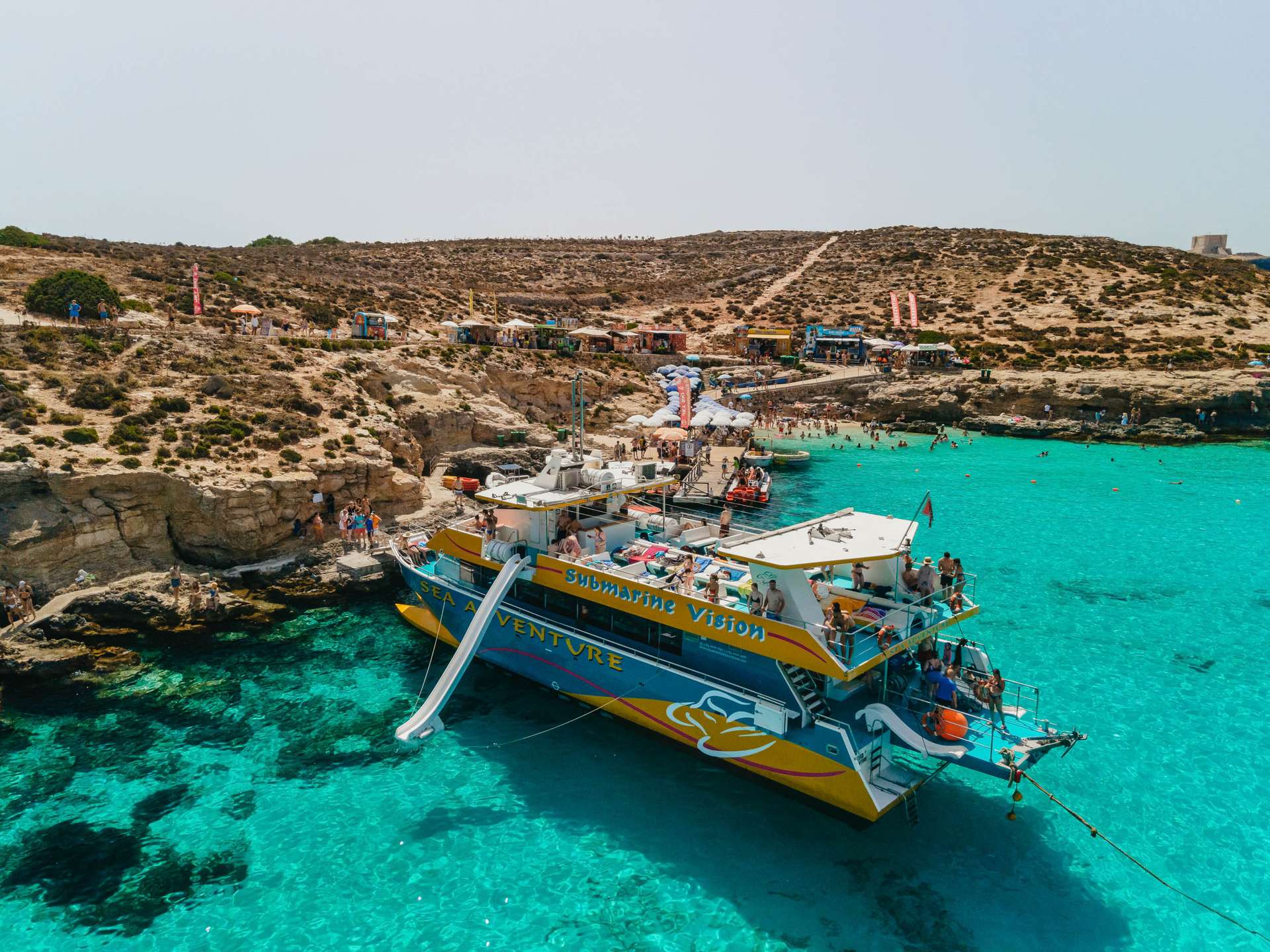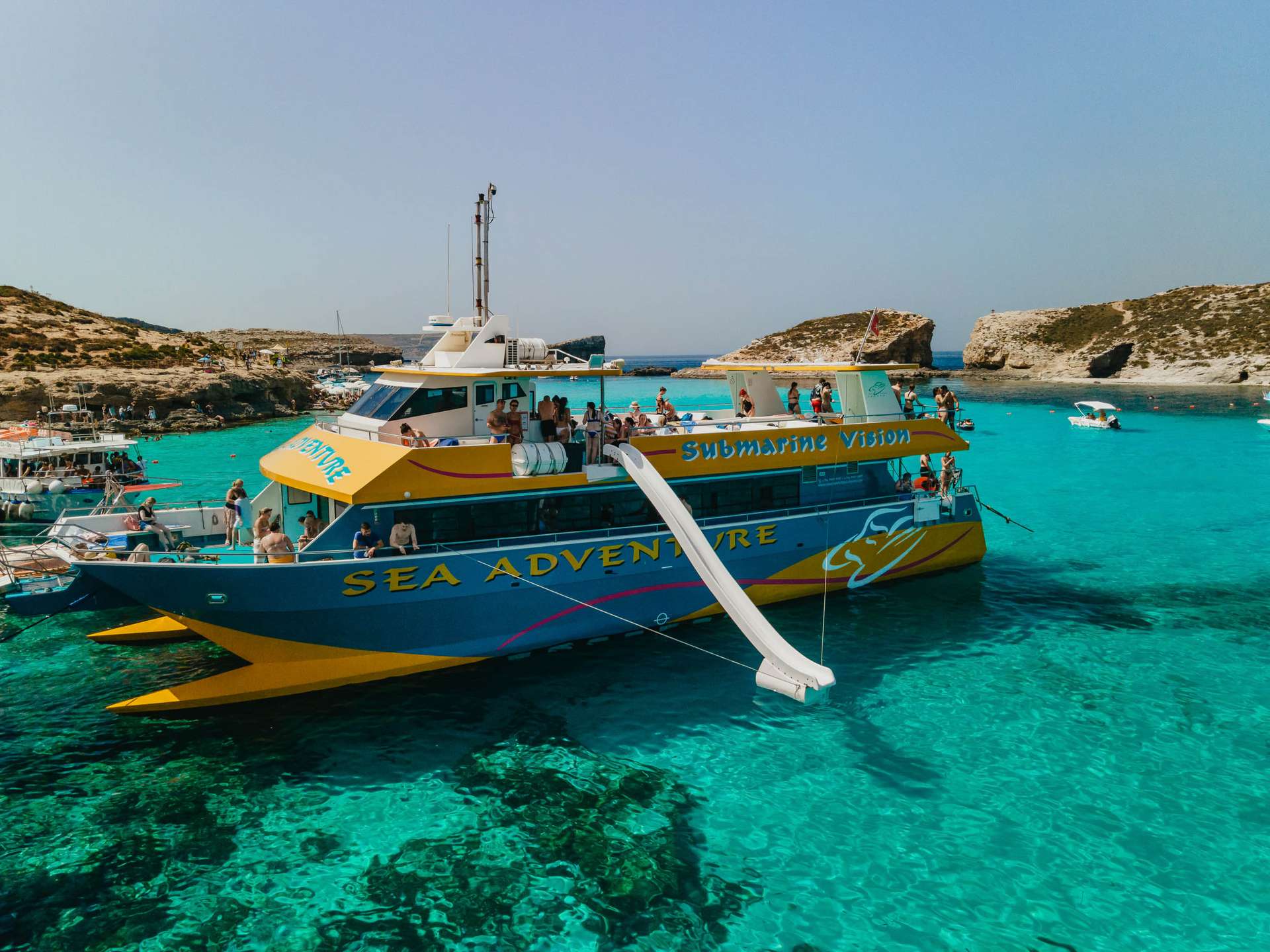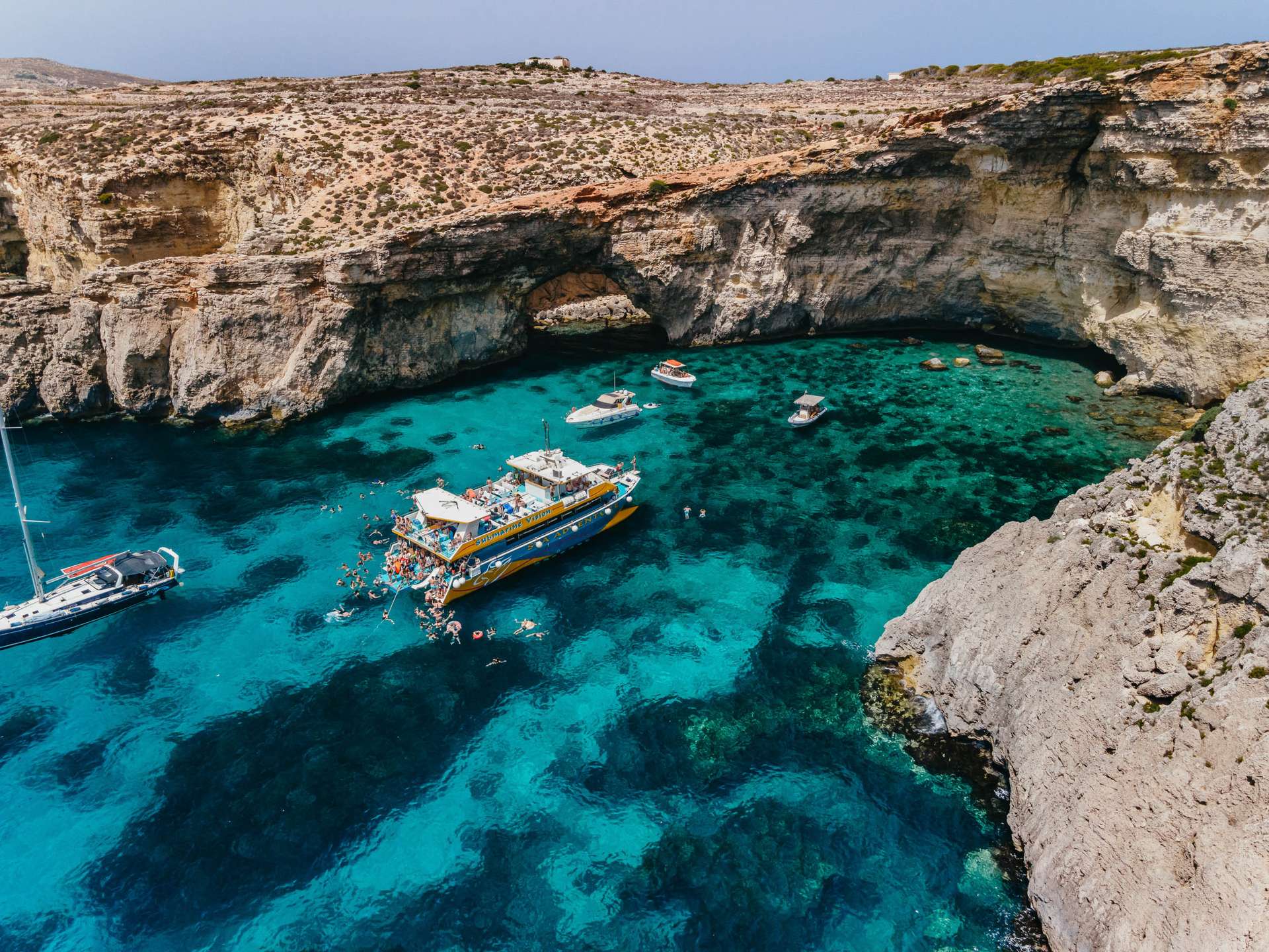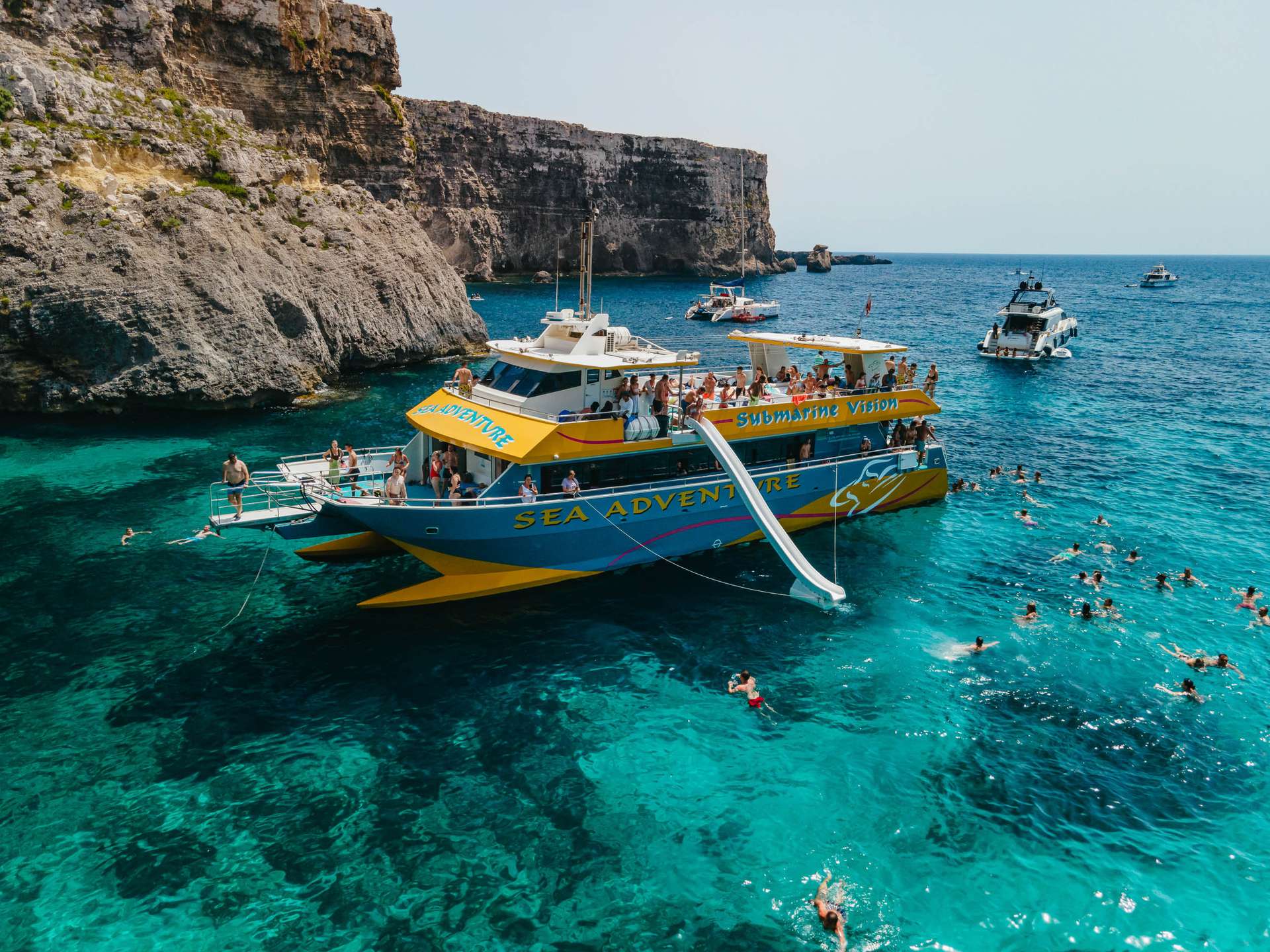 Your journey begins at the Bugibba Jetty, where our modern catamaran’s sets off along Malta’s spectacular northern coast. Along the way, you’ll pass dramatic cliffs, hidden coves, and naturally formed sea caves that are only accessible by boat. We also cruise past St. Paul’s Island, home to a prominent statue of the Apostle Paul.
