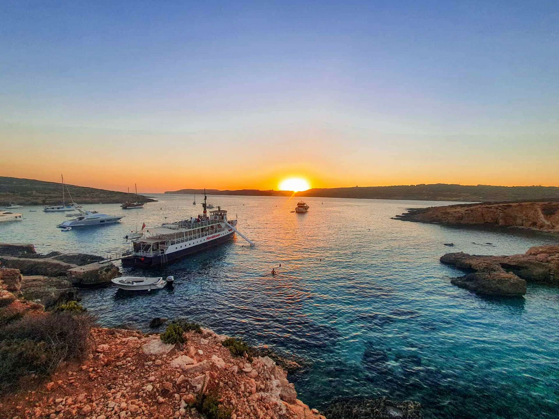 Relax, Swim & Explore: Unwind as you glide past St. Paul’s Island, Ghadira Bay, Coral Cove, and Ahrax Point, admiring dramatic cliffs, hidden coves, and natural rock formations. Stop for just over two hours at the Blue Lagoon, where you can swim in the crystal-clear, cyan waters, stroll the pristine beach in the cooler evening light, or simply relax on the upper deck as the sun sets over Comino.