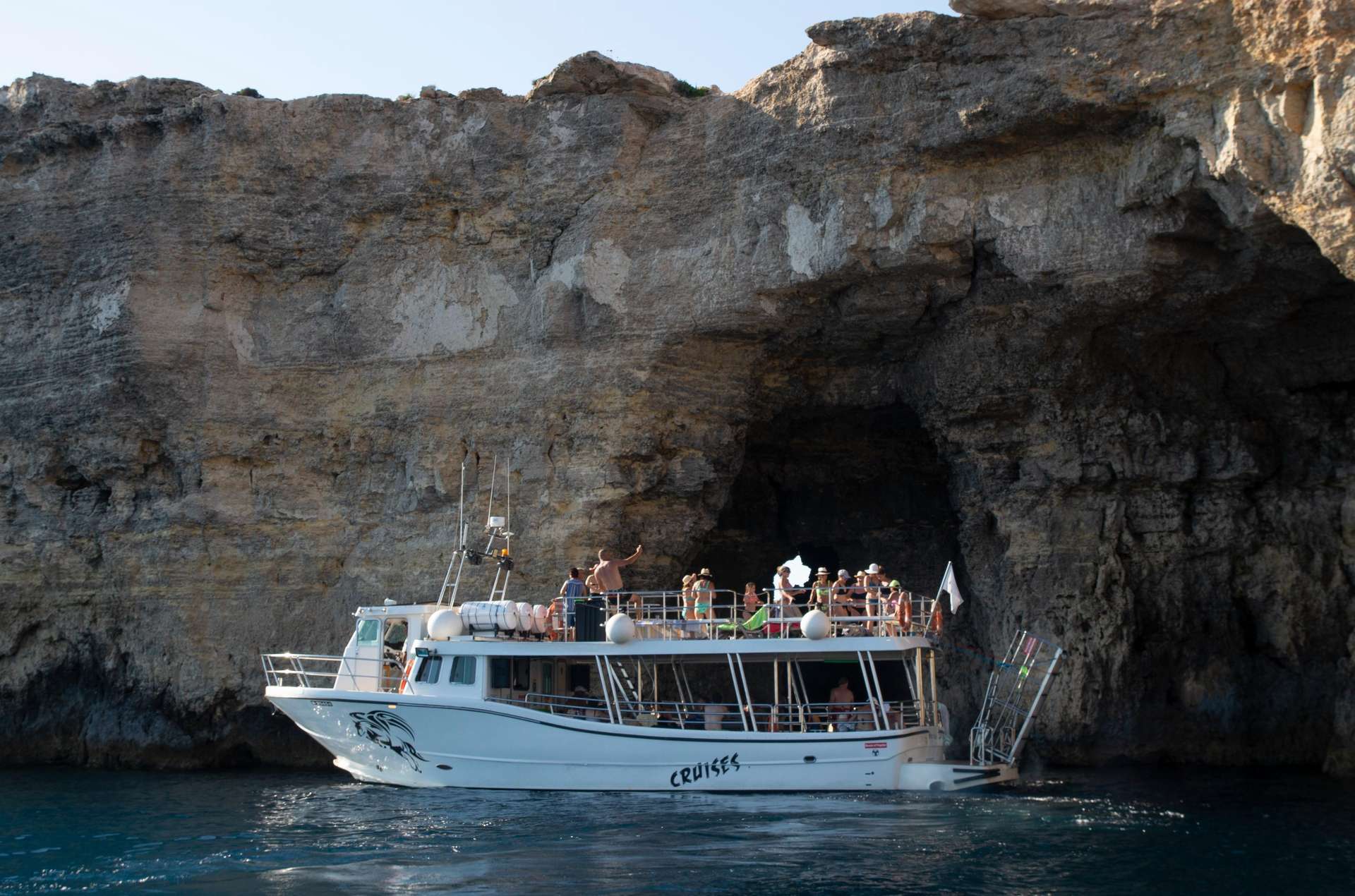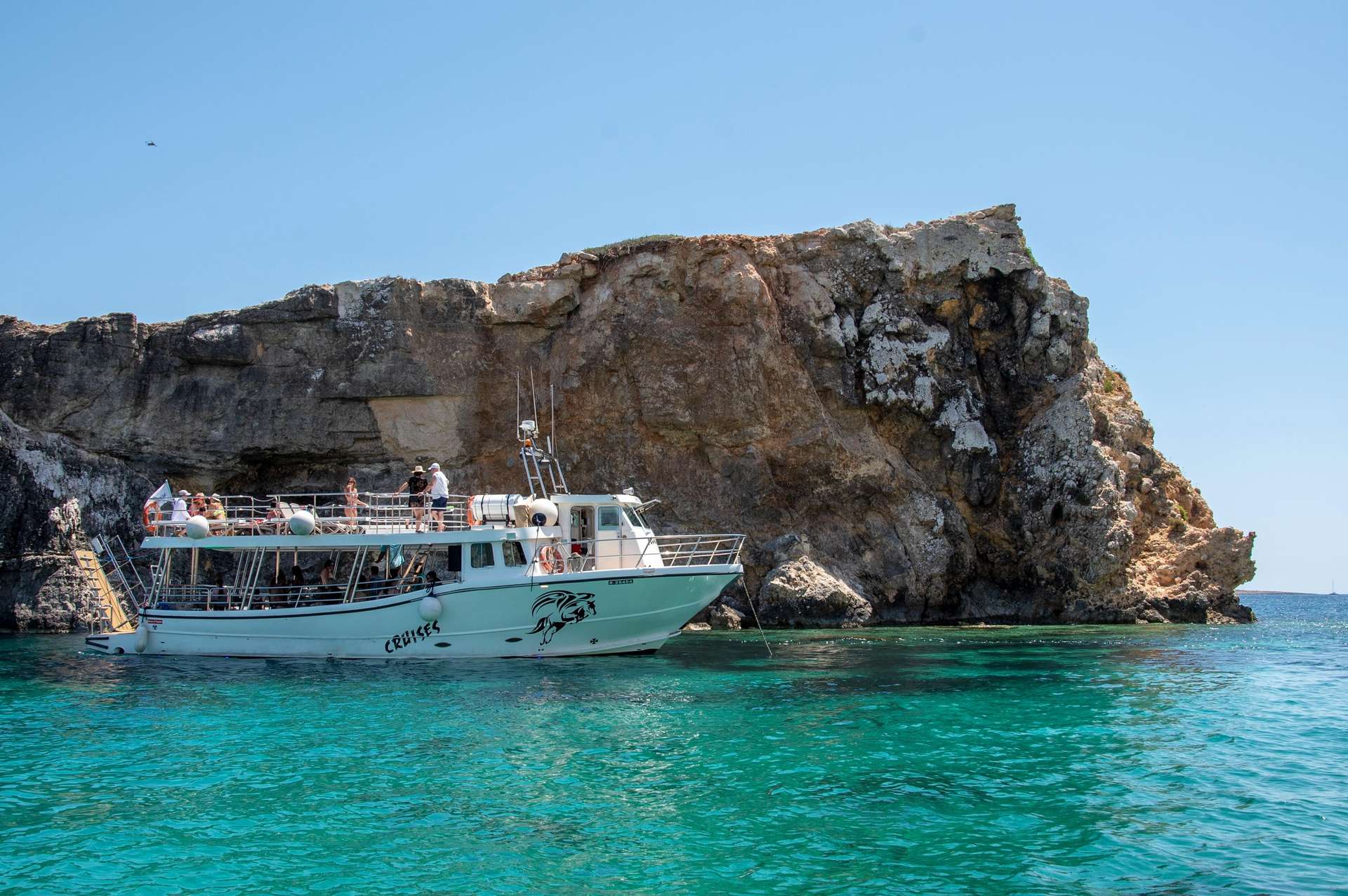 Cruising along the northern coastline, we will travel first to the iconic Blue Lagoon, where we will have our first swim stop of approximately 1½–2 hours. Get ready to be amazed by the turquoise, crystal-clear waters of this beautiful lagoon! This picturesque bay with transparent cyan waters, a white sandy base, and rich marine life is the perfect spot for a relaxing break. Spend your time here soaking up the sun, swimming, snorkelling, or simply enjoying a walk in the countryside of Comino Island. The boat trip will be anchored near the Blue Lagoon; therefore, one can also spend his time relaxing on the boat.