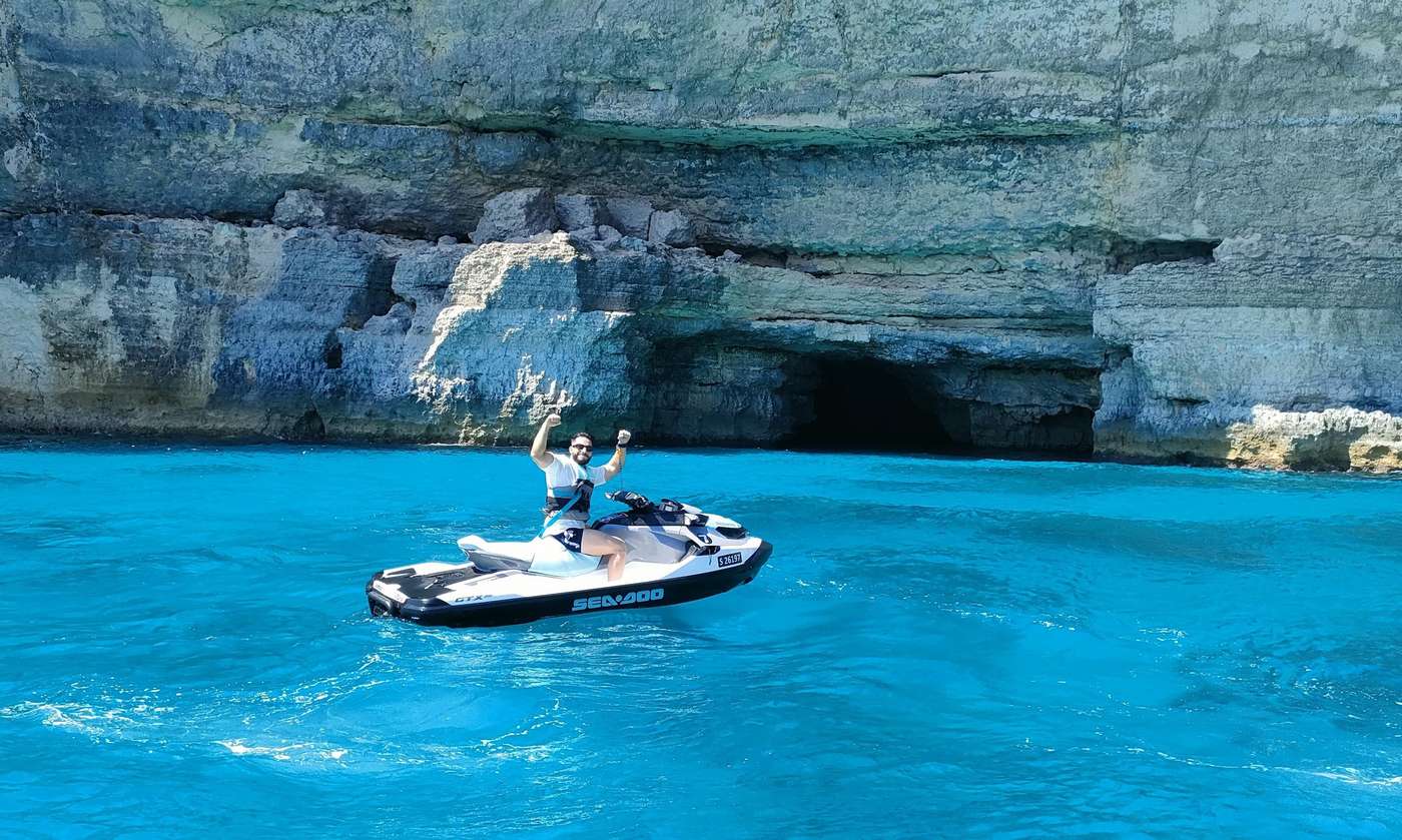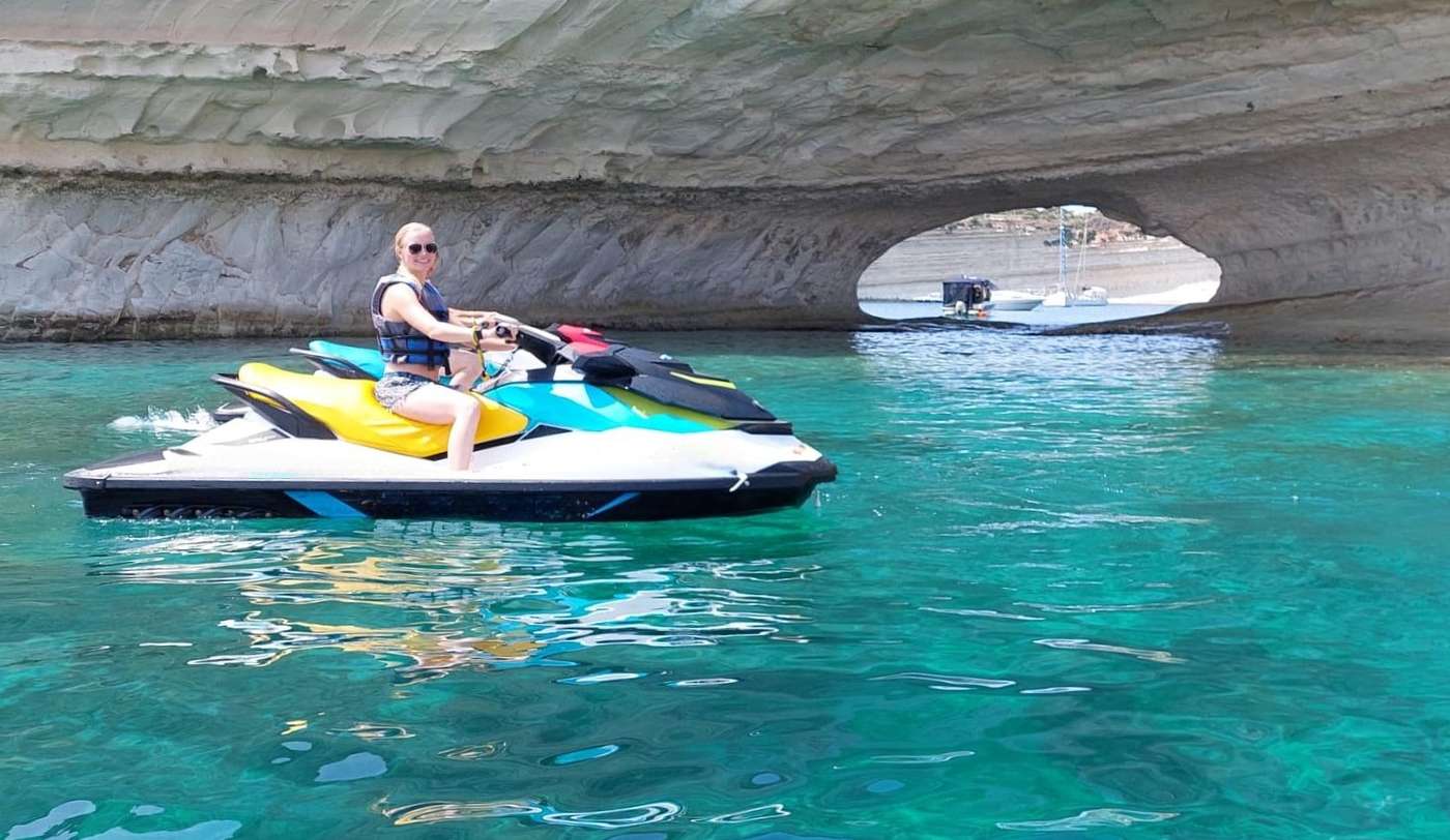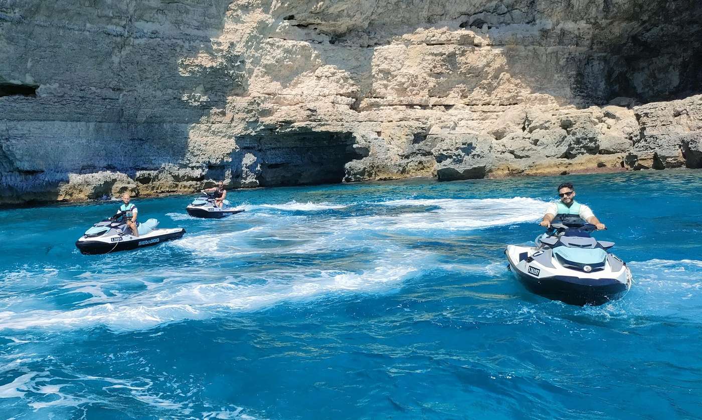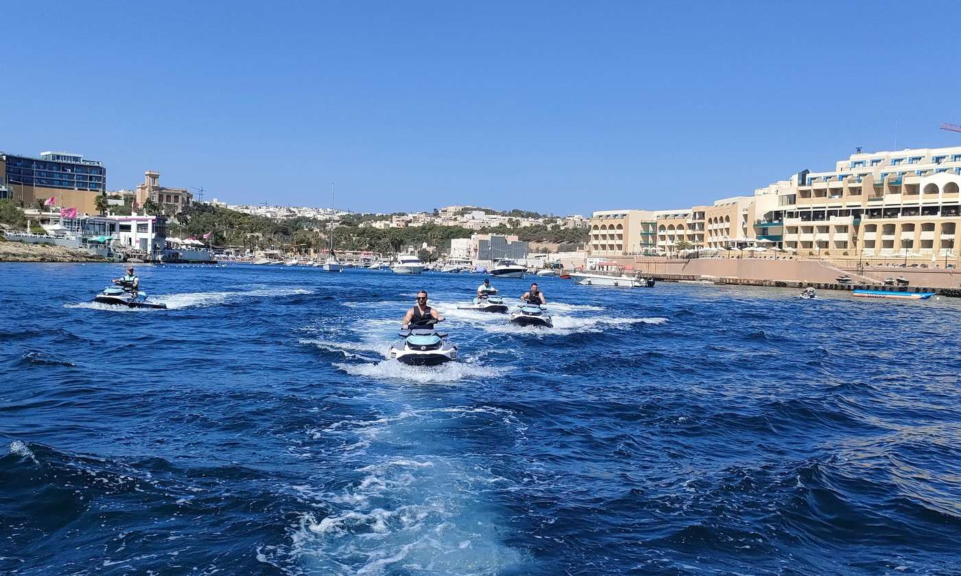 Departing from our base in St. Julian’s at 1:00 PM, you will be led by one of our skilled and experienced instructors on a memorable and exciting journey to the northern part of the island, visiting the magnificent Blue Lagoon on Comino Island and passing by picturesque and gorgeous locations such as Mellieha Bay, St. Paul’s Bay, and around St. Paul’s Islands. Take in the beauty of the Mediterranean Sea, the breathtaking seascapes, and the magnificent scenery while having an unforgettable time riding one of our jet skis.