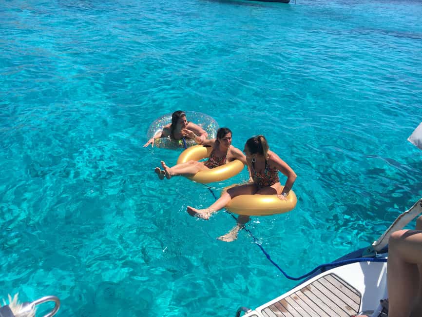 Throughout the day, enjoy gourmet snacks, a freshly prepared Mediterranean lunch, extra on demand and chilled beverages—all served on board as you take in panoramic views of the coastline. Snorkeling gear, paddleboards, and floaties are available for those eager to dive in, or you can unwind to the gentle rhythm of the waves with a glass of wine in hand.